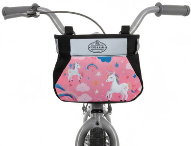 Tote & Kari Kids Bike Basket with Cup Holder ∣ Waterproof & Durable Accessories ∣ Children's Front Handlebar Bag ∣ Rugged Zipper Pocket, Fits Girls, Boys, Kids & Adult Bicycles & Scooters Unicorn, Space, Axolotl, Paris Patterns